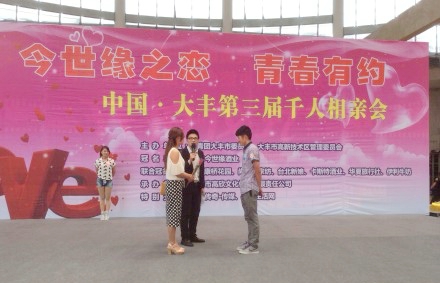 8月10日上午,由共青團大豐市委員會、今世緣酒業聯合主辦的“今世緣之戀?青春有約”中國?大豐第三屆千人相親會在大豐市奧體中心舉行,吸引了近千名單身男女前來參加。大豐市團市委副書記蔣真雅、今世緣酒業鹽城營銷中心經理周永和等出席活動。