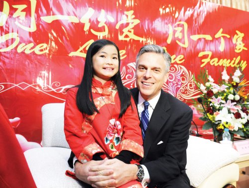 圖中,依偎在前美駐華大使洪博培懷里的女孩,是他的中國養女楊樂意。