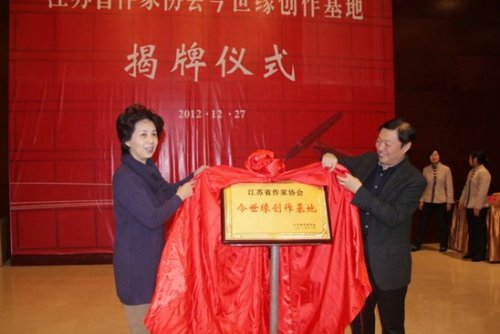 12月27日,“江蘇省作家協會今世緣創作基地”在今世緣酒業舉行揭牌儀式。淮安市委副書記、市長曲福田欣然祝賀。省作協主席、黨組書記范小青,淮安市委常委、宣傳部長戚壽余共同為該基地揭牌。淮安市委常委、漣水縣委書記董平參加文企聯誼活動。省作協黨組副書記、書記處書記張王飛主持儀式。省作協黨組成員、書記處書記王朔以及相關部門負責人,淮安市文聯主席馬慶倫,今世緣酒業董事長、總經理周素明,漣水縣委常委、宣傳部長賈振旗出席揭牌儀式?;窗彩凶鲄f、漣水縣作協負責人及部分作家見證了這一盛事。