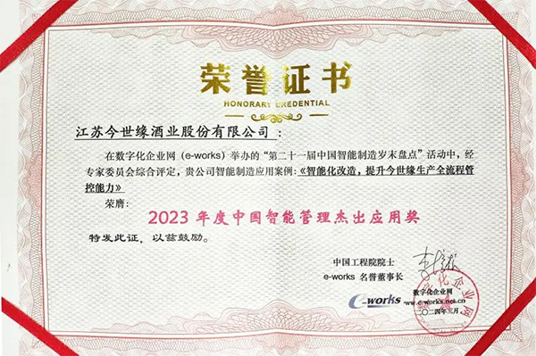近年來,今世緣在白酒生產科技研發及裝備方面始終處于行業領先地位。早在2005年,今世緣就開始自動化釀酒生產線的研發,并在白酒調配、庫存管理等方面啟動自動化和信息化升級。2015年,中國首套裝甑機器人生產線在今世緣投產。2016年,中國酒業協會授予今世緣“中國白酒智能化釀酒示范車間”稱號。今年,在第二十一屆中國智能制造歲末盤點頒獎典禮在上,今世緣酒業智能制造應用案例《智能化改造,提升今世緣生產全流程管控能力》榮獲“2023年度中國智能管理杰出應用獎”。