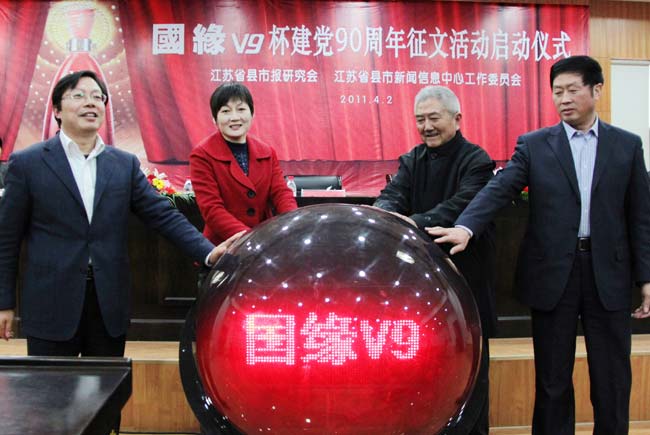 4月2日,由江蘇省縣市報研究會、江蘇省新聞信息中心工委以及江蘇今世緣酒業股份有限公司聯合舉辦的“國緣V9”杯慶祝建黨90周年征文活動啟動儀式在今世緣酒業舉行。中共漣水縣委常委、宣傳部長王立華,省縣市報研究會副會長、省新聞信息中心工委主任嚴峰,省縣市報研究會名譽會長沈成嵩,省縣市報研究會副秘書長、省新聞信息中心工委副主任吉光,省新聞中心工委副主任葛志亮,漣水縣委宣傳部副部長、新聞信息中心主任張學榮等全省市縣報負責人出席此次活動。今世緣酒業董事長、總經理周素明,黨委副書記、副總經理朱懷寶分別參加了歡迎宴會以及啟動儀式。