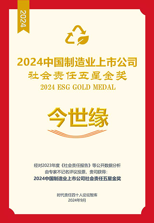 “2024中國制造業上市公司社會責任五星金獎”的獲得,標志著今世緣酒業在可持續發展道路上取得了重要里程碑式的成就。這一榮譽將激勵著今世緣酒業繼續前行、不斷創新,為構建更加美好的社會貢獻更多“緣力量”。
