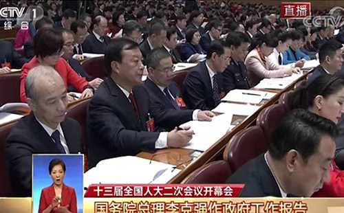 3月5日上午,第十三屆全國人民代表大會第二次會議在北京人民大會堂開幕。圖為央視直播全國人大代表,公司董事長周素明與代表們一起聆聽李克強總理作政府工作報告的畫面。