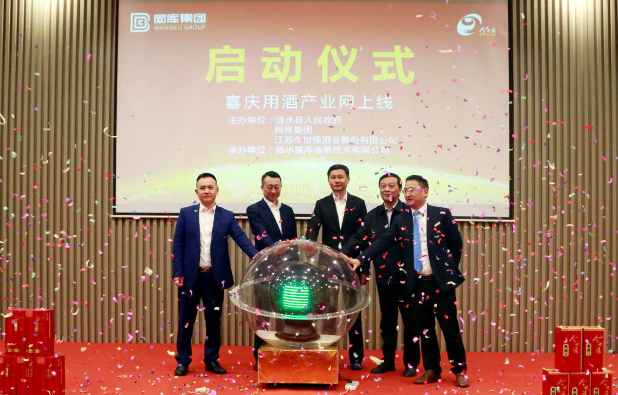 漣水縣委副書記、縣長時勇(中), 今世緣酒業(yè)黨委書記、董事長、總經(jīng)理周素明(右二),網(wǎng)庫集團總裁李軍保(左二) 漣水縣副縣長張亮(右一),網(wǎng)庫集團江蘇大區(qū)總經(jīng)理王亮(左一) 共同為中國喜慶用酒產(chǎn)業(yè)網(wǎng)上線啟動水晶球。