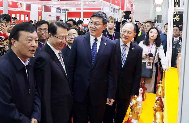 副省長郭元強(前排左二)、市委書記姚曉東(前排左三)等與會領導,在今世緣酒業黨委書記、董事長、總經理周素明(前排左一)陪同下參觀今世緣展廳。凌泰 攝