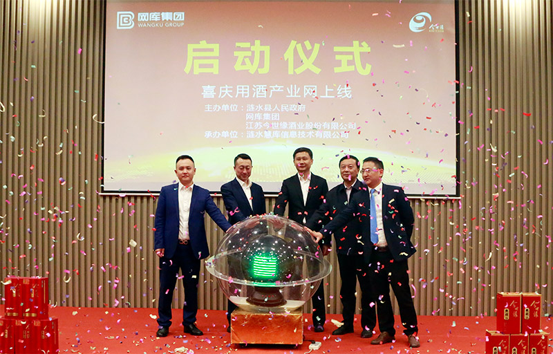 漣水縣委副書記、縣長時勇(中),今世緣酒業(yè)黨委書記、董事長、總經(jīng)理周素明(右二),網(wǎng)庫集團總裁李軍保(左二) 漣水縣副縣長張亮(右一),網(wǎng)庫集團江蘇大區(qū)總經(jīng)理王亮(左一) 共同為中國喜慶用酒產(chǎn)業(yè)網(wǎng)上線啟動水晶球。