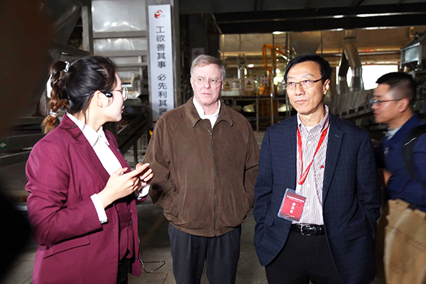 美國(guó)俄勒岡州立大學(xué)Michael Qian教授(右二)、美國(guó)伊利諾伊大學(xué)食品化學(xué)專家Keith Cadwallader教授(左二)參觀今世緣酒業(yè)智能化示范車間。