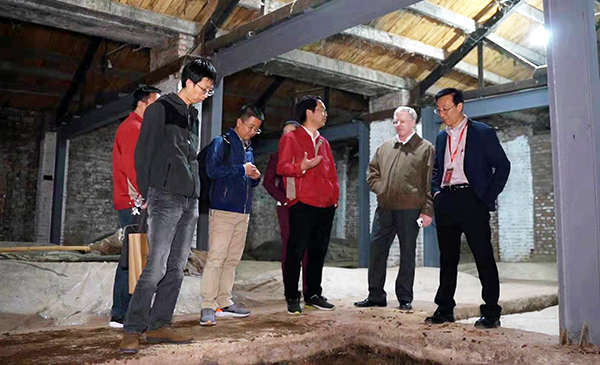 美國(guó)俄勒岡州立大學(xué)Michael Qian教授(右一)、美國(guó)伊利諾伊大學(xué)食品化學(xué)專家Keith Cadwallader教授(右二)參觀今世緣酒業(yè)老窖池。