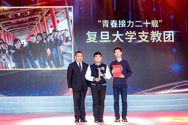 公司黨委副書記、副總經理倪從春為“青春接力二十載”的復旦大學支教團頒獎。