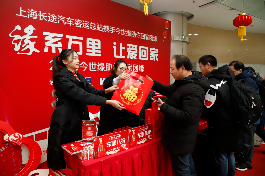 在上海汽車客運總站,旅客聚集在今世緣活動展臺前,有的一手拉著行李,一手拎著今世緣贈送的新年福袋,臉上透露出開心的笑容;有的拿著現(xiàn)場返現(xiàn)的福利向同伴炫耀著;還有旅客直接獲得了今世緣的美酒,歡歡喜喜帶著它回家過年……“很意外,這是一份溫暖的禮物,感謝今世緣!”在上海務(wù)工的安徽黃山鄺毅,領(lǐng)到了一張今世緣“五折車票”。