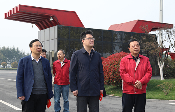 今世緣酒業(yè)黨委書記、董事長、總經(jīng)理周素明陪同湯溝兩相和酒業(yè)黨委書記、董事長朱耀匯(中)在今世緣企業(yè)文化廣場。