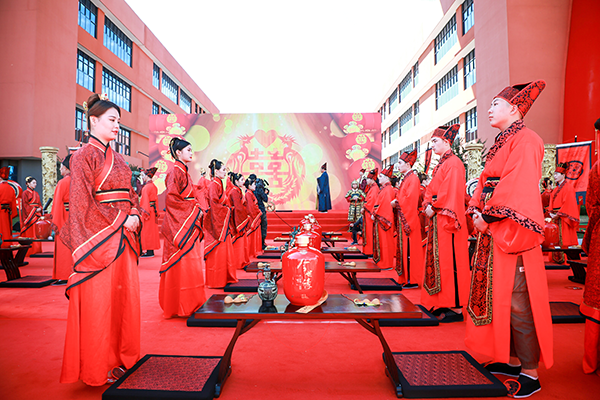 儀式當天,70 對新人身著漢服緩緩入場,行六禮之制,享婚典之儀,飲愛情之酒,再現(xiàn)了中華民族傳統(tǒng)婚典文化的古韻之美,還原了一場原汁原味的傳統(tǒng)漢式婚禮。來自全國各地的 70 對新人,在萬眾矚目的漢式集體婚禮上喜結(jié)良緣,傳承優(yōu)秀傳統(tǒng)文化,傳播美好情緣,傳遞積極婚戀觀,以最喜慶熱烈的方式,向新中國成立 70 周年致敬獻禮。