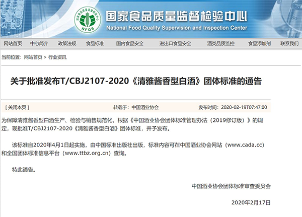 2020年2月17日,《清雅醬香型白酒》團體標準發布。