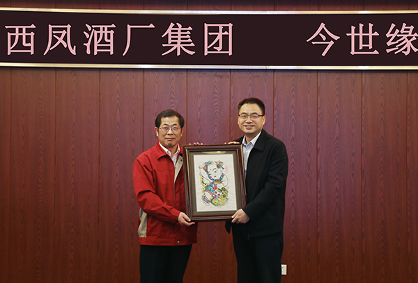 公司黨委副書記、副董事長、總經理顧祥悅(左)與陜西西鳳酒廠集團有限公司黨委副書記、總裁楊宏亮代表企業互贈禮物。