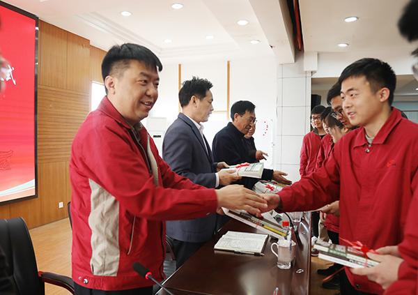 今世緣酒業黨委副書記、工會主席魯正波(左一)等領導為新學員授書。