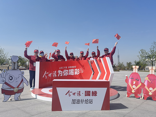 一大早,市政務服務中心附近人潮如海、彩旗飄揚。今世緣馬拉松隊在淮安大區副總經理李中亮的帶領下,整齊列隊,高舉“100年歷程牢記、犇向醉美明天”“國緣V9醬香新經典”大旗,高唱國歌,隨激情四射的人群全力向著終點跑去。在賽道24.2公里處,“今世緣加油補給站”是為馬拉松選手補給與加油助威的五個站點之一,今世緣人揮動特別制作的“國緣V9”“今世緣D30”小木偶,充分展示今世緣的熱情與文化。