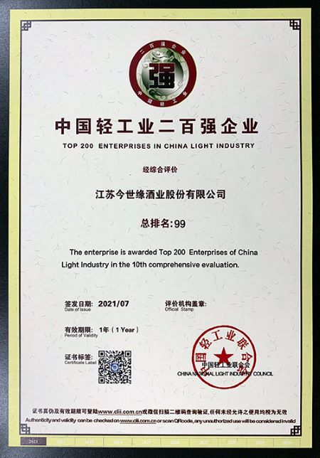 7月20日,由中國輕工業聯合會主辦、中國輕工業信息中心承辦的“奮進十四五·領航新消費”中國輕工業百強企業高峰論壇在北京舉行。會上發布“中國輕工業二百強企業”等評選結果,今世緣酒業榮獲2020年度“中國輕工業二百強企業”“中國輕工業科技百強企業”“中國輕工業食品行業五十強企業”榮譽稱號。
