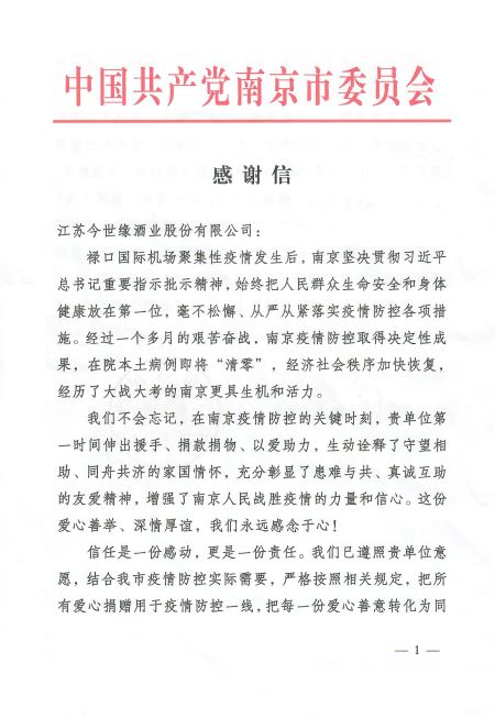 這是9月7日,中共南京市委、南京市人民政府給今世緣酒業(yè)的感謝信。信中對今世緣酒業(yè)助力南京疫情防控,捐款捐物的愛心善舉表示感謝。