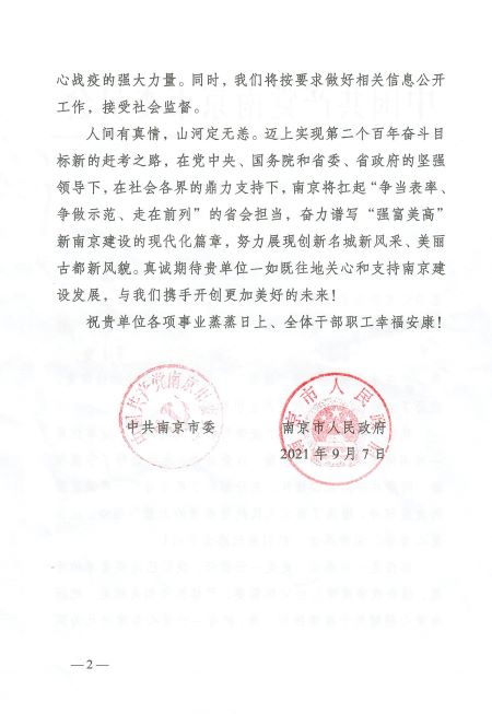 “我們不會忘記,在南京疫情防控的關鍵時刻,貴單位第一時間伸出援手、捐款捐物、以愛助力,生動詮釋了守望相助、同舟共濟的家國情懷,充分彰顯了患難與共、真誠互助的友愛精神,增強了南京人民戰(zhàn)勝疫情的力量和信心。這份愛心善舉、深情厚誼,我們永遠感念于心!”