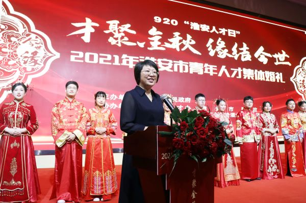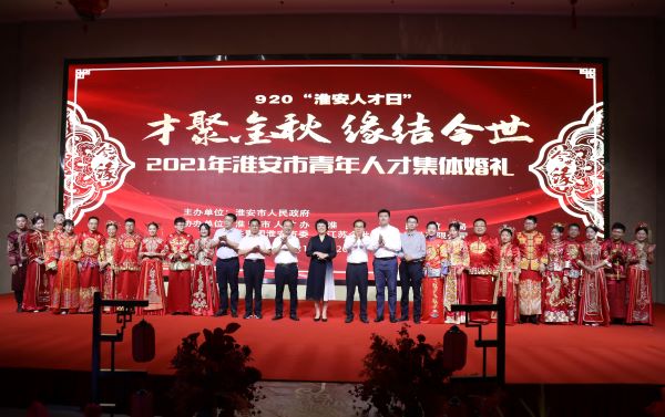 2021淮安市第二屆青年人才集體婚禮由淮安市人民政府主辦,市人才辦、市民政局、團市委、今世緣酒業共同承辦。淮安市民政局黨組書記沈在宏為新人頒發紀念婚書。淮安市委組織部副部長、老干部局局長、市人才辦主任姜洪洋,共青團淮安市委書記何喆共同為新人頒發愛情信物。