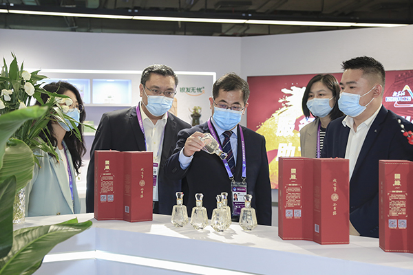 11月7日,今世緣酒業黨委副書記、副董事長、總經理顧祥悅,黨委副書記、監事會主席倪從春參觀第四屆中國國際進口博覽會新華社民族品牌工程·品牌聯合館今世緣展區。
