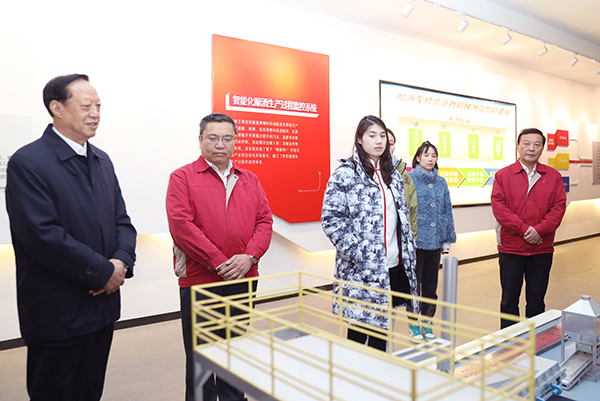 江蘇省政協(xié)原副主席、江蘇省發(fā)展體育基金會理事長張九漢(左一)率領(lǐng)東京奧運(yùn)江蘇健兒代表團(tuán)參觀今世緣“中國白酒智能化釀造示范車間”。