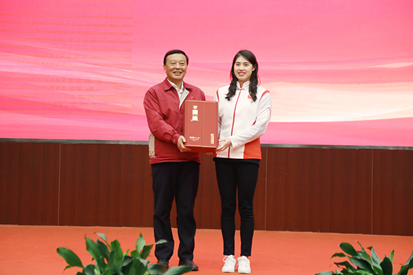 今世緣酒業(yè)黨委書記、董事長周素明向東京奧運(yùn)冠軍張雨霏贈送慶功酒國緣V9。