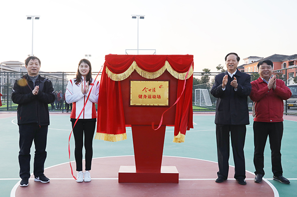 江蘇省政協(xié)原副主席、江蘇省發(fā)展體育基金會理事長張九漢(右二)、江蘇省體育局副局長王志光(左一)、奧運(yùn)冠軍張雨霏與今世緣酒業(yè)黨委副書記、工會主席魯正波共同為“今世緣健身運(yùn)動場”揭牌。