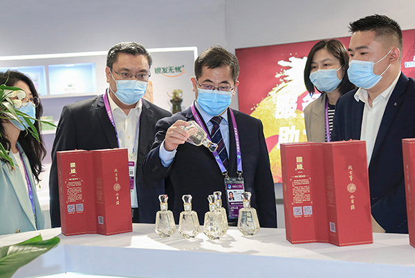 2021年11月7日,今世緣酒業黨委副書記、副董事長、總經理顧祥悅(中)察看第四屆中國國際進口博覽會今世緣展區。