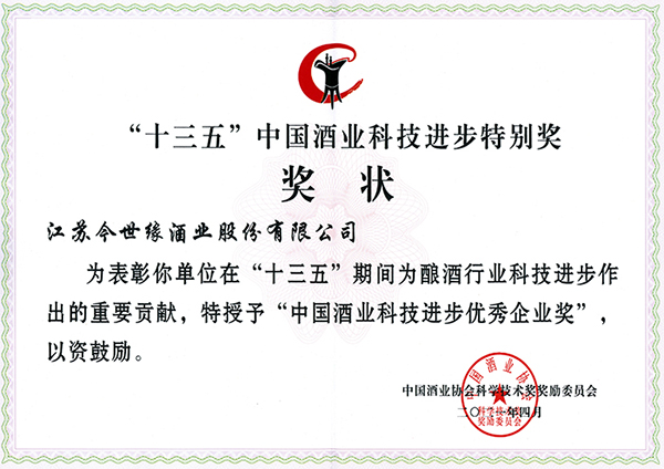 2021年4月,今世緣榮獲中國酒業協會“中國酒業科技進步優秀企業獎”。