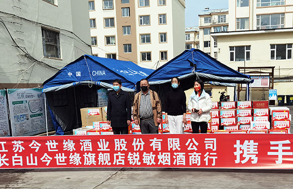 今世緣東北營銷中心攜手銳敏煙酒商行,前往吉林省長白山宣傳部、電視臺、白山社區慰問。長白山黨工委宣傳部部長孟凡迎說,將把企業的愛心與支持化為戰“疫”動力。在遼寧,東北營銷中心攜手大文煙酒,慰問了阜新市海州區疫情防控指揮部、西山社區、大眾社區、興盛社區等地疫情防控人員。