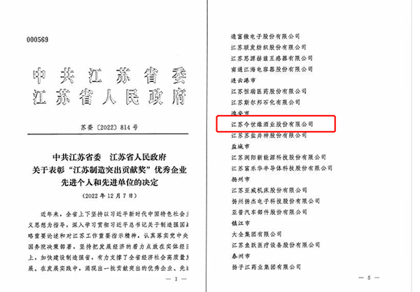 近日,中共江蘇省委、江蘇省人民政府發(fā)文表彰“江蘇制造突出貢獻(xiàn)獎(jiǎng)”優(yōu)秀企業(yè)、先進(jìn)個(gè)人和先進(jìn)單位。今世緣酒業(yè)榮獲“江蘇制造突出貢獻(xiàn)獎(jiǎng)”優(yōu)秀企業(yè)稱號(hào)。