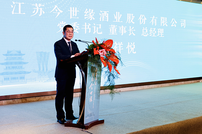 今世緣酒業黨委書記、董事長、總經理顧祥悅在“百強蘇商淮安行”活動上致辭。