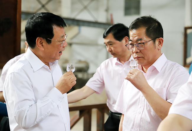今世緣酒業黨委書記、董事長、總經理顧祥悅與洋河股份黨委副書記、總裁鐘雨品嘗洋河釀酒車間生產的原酒。