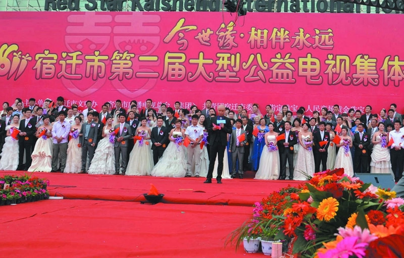 5月1日,30對新人參加了在泗陽舉行的集體婚禮,婚禮現(xiàn)場花團(tuán)錦簇,彩旗飄揚(yáng),洋溢著濃濃的喜慶氛圍。5月2日,宿遷集體婚禮現(xiàn)場。來自各地的90對新人,伴著優(yōu)美的《婚禮進(jìn)行曲》,微笑著踏上紅地毯,走進(jìn)婚姻的殿堂。婚禮現(xiàn)場活動(dòng)由江蘇電視臺(tái)《非誠勿擾》欄目組的樂嘉主持。據(jù)悉,婚禮活動(dòng)的舉辦旨在倡導(dǎo)婚事新辦簡辦和健康文明的社會(huì)新風(fēng)尚,同時(shí)慶祝中國共產(chǎn)黨建黨90華誕。