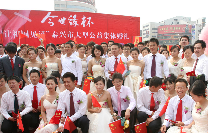 10月1日上午,“今世緣”杯“讓祖國見證”泰興市大型公益集體婚禮在市區鼓樓廣場隆重舉行。68對新人喜結良緣、祝福祖國。泰興市委常委、宣傳部長戴仁泉,泰興市副市長周桂香,江蘇今世緣酒業有限公司副總經理、營銷總監倪從春為新人們證婚、致辭。