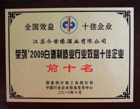 10月22日,第七屆全國工業重點行業效益十佳企業高峰論壇在四川成都舉行,江蘇今世緣酒業有限公司榮列“2009年中國白酒制造業行業效益十佳企業”,這也是繼2008年躋身行業“效益十佳”行列后,蟬聯這一殊榮。