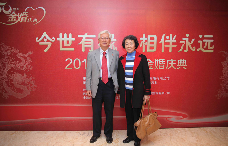 “攜手真情長憶,更冀重來半百,永久踏仙田。幸有前緣在,松鶴伴琴弦。”這是程裕禎老人在現場為今年金婚特意填的一首詞。程裕禎退休前任北京外國語大學中文學院院長兼海外漢學研究中心主任。老伴解波退休前在人民日報工作,曾獲“全國三八紅旗手”、“中直機關首屆十大女杰”等稱號。談起他倆的愛情,程裕禎說,他與解波結緣于未名湖畔,都是北京大學中文系的。戀愛后,每到寒暑假,她就要回上海探親。當時的學生專列,沒有發車的準確時刻,程裕禎就送她早早到車站等候。列車啟動,已是夜半時分,而公交早已停運,他就一直綣在候車室等待天亮,才乘公交回學校。解波說,在2003年一度病危,以后又多次住院治療,每次都是程裕禎陪伴照料,病房醫護都稱他是“年紀最大的護工”。
